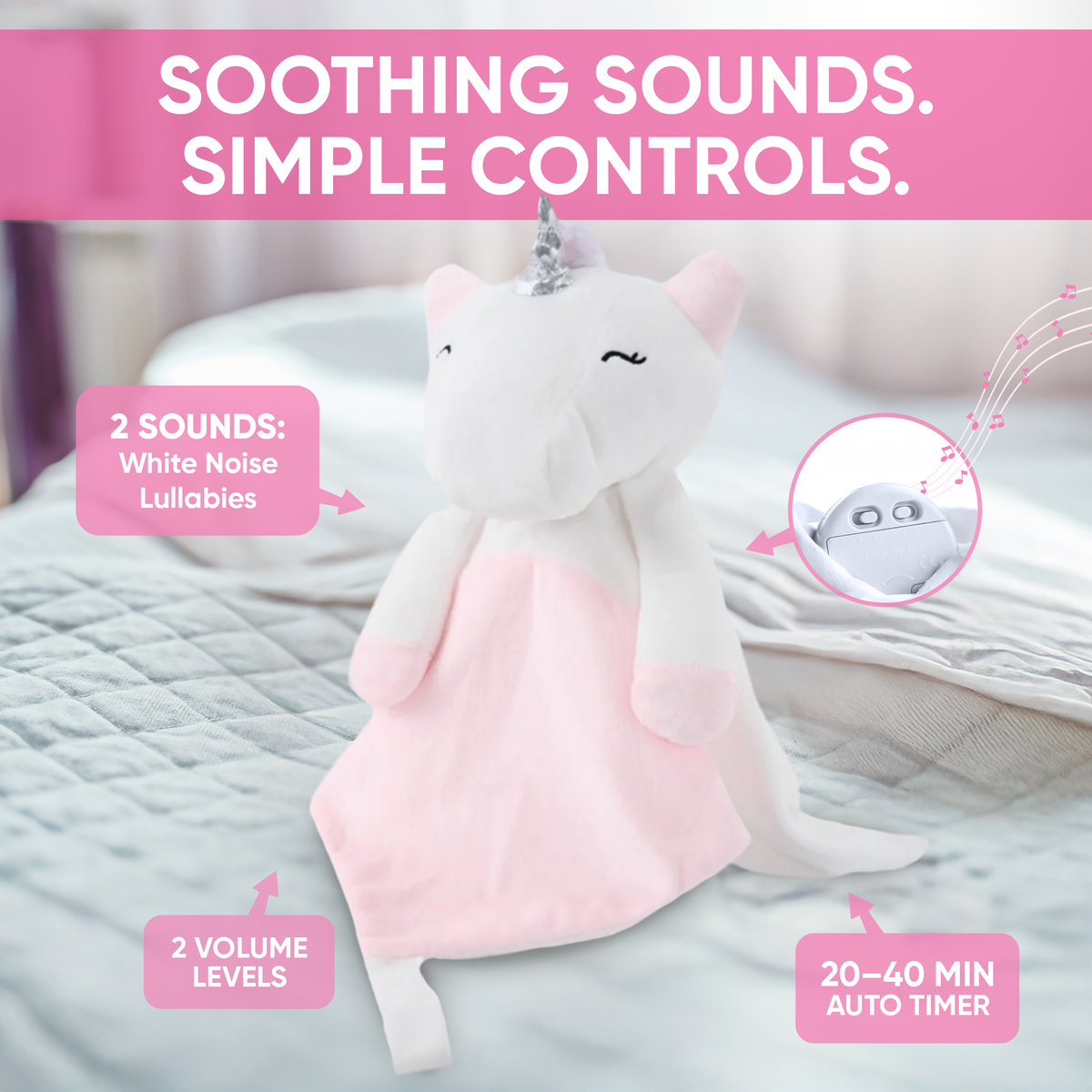 🦄 EASY TO OPERATE: Maisie the Unicorn - Our baby soother allows your child to play with the stuffed animal and then gently drift off to sleep with the built-in sound machine. It's incredibly easy to use: Simply press the in-ear buttons to trigger the sound choices of white noise mixed with a heartbeat or a lullaby. On the back of the sound device, you can choose from two volume levels and two lengths: 20 minutes or 40 minutes.